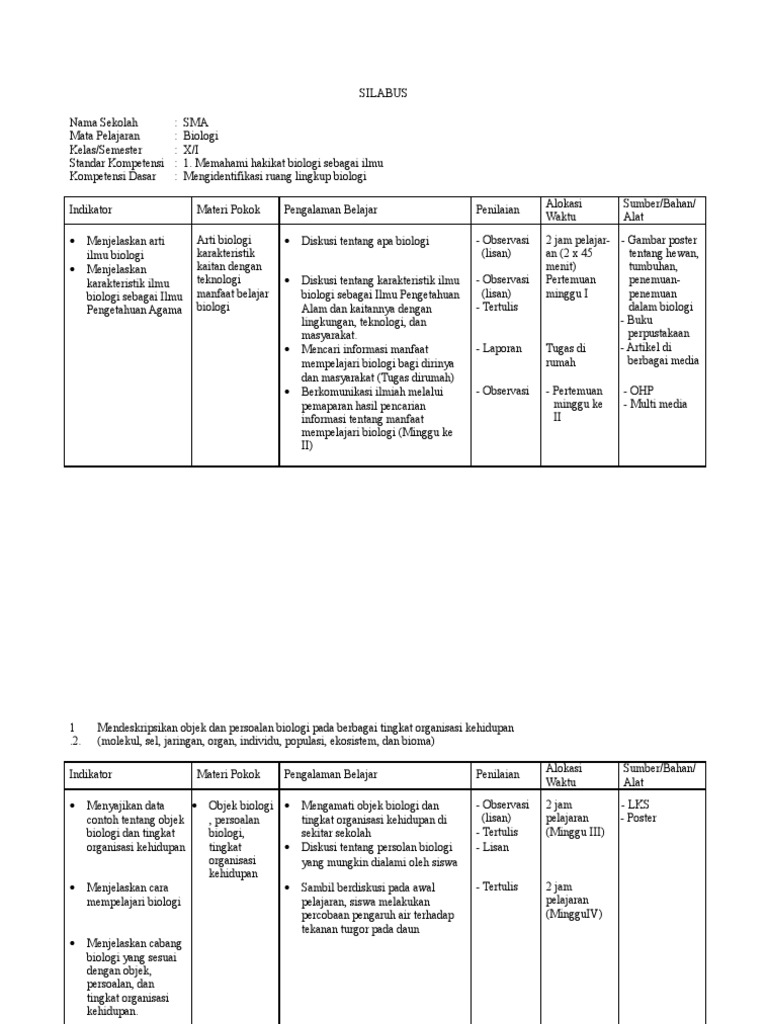 November 17, 2013 fatihulihsan 2 komentar. Jika masih susah dalam mencari kumpulan silabus sma kurikulum 2013 silahkan lihat tag berikut silabus smk kurikulum 2013 revisi 2016,silabus kurikulum 2013 sma revisi,rpp sma kurikulum 2013 revisi 2016,silabus matematika sma kurikulum 2013 revisi 2016. Silabus biologi x kurikulum 2013. Perangkat silabus biologi k13 kelas 11 sma semester 1 dan 2 edisi revisi 2021 ini kiranya dapat menjadi tambahan dan arsip dalam membuat perangkat pembelajaran. Silabus merupakan penjabaran standar kompetensi dan kompetensi dasar ke dalam materi pokok/ pembelajaran, kegiatan pembelajaran, dan indikator pencapian kompetensi untuk penilaian.