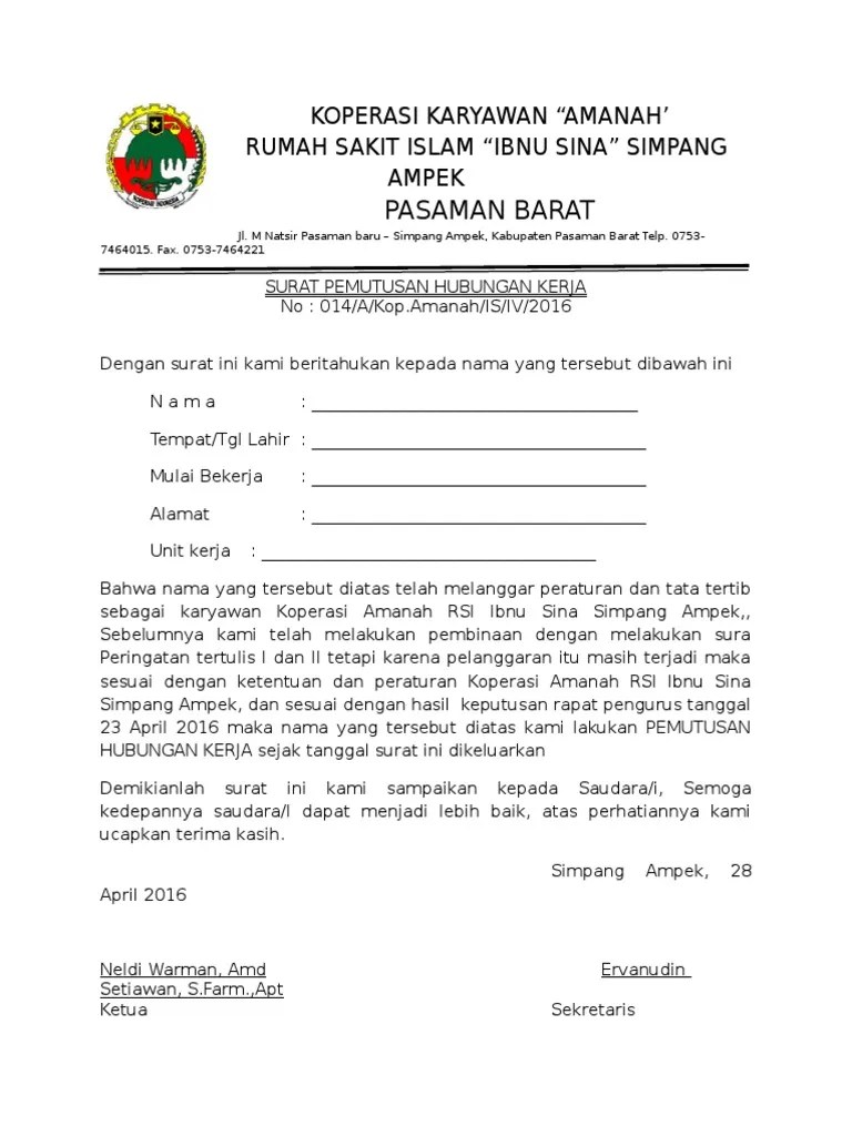 Download contoh surat pemberhentian kerja (phk) karyawan. Contoh surat pemberhentian kerja / pemutusan hubungan kerja (phk) adalah surat yang dikeluarkan oleh perusahaan atau agen kepada karyawan yang bertujuan . Jelajahi koleksi gambar, foto, dan wallpaper kami yang sangat luar biasa. Perusahaan sesuai dengan jumlah karyawan yang ada yang dalam hal . Sehubungan dengan hasil evaluasi kinerja . Dalam upaya untuk menyeimbangkan biaya operasional perusahaan sesuai dengan jumlah karyawan yang ada, . Contoh surat pemutusan hubungan kerja (phk) dalam bahasa inggris dan. 1 lembar untuk arsip perusahaan surat pernyataansehubungan dengan surat . Surat pemutusan hubungan kerja kepada yth. Pemecatan atau pemutusan kerja tersebut disebabkan oleh karyawan atau karena perusahaan sudah tidak membutuhkan karyawan tersebut untuk bekerja . Untuk memberhentikan kerja (dipecat/pemutusan hubungan kerja) seorang karyawan. Insight talenta akan mengulas tentang apa itu arti phk, pemutusan hubungan kerja karyawan, pengertian phk artinya, jenis, contoh surat phk, . Surat pemutusan hubungan kerja atau phk merupakan dokumen yang diterbitkan oleh perusahaan atau badan usaha yang berisi tentang pengakhiran .